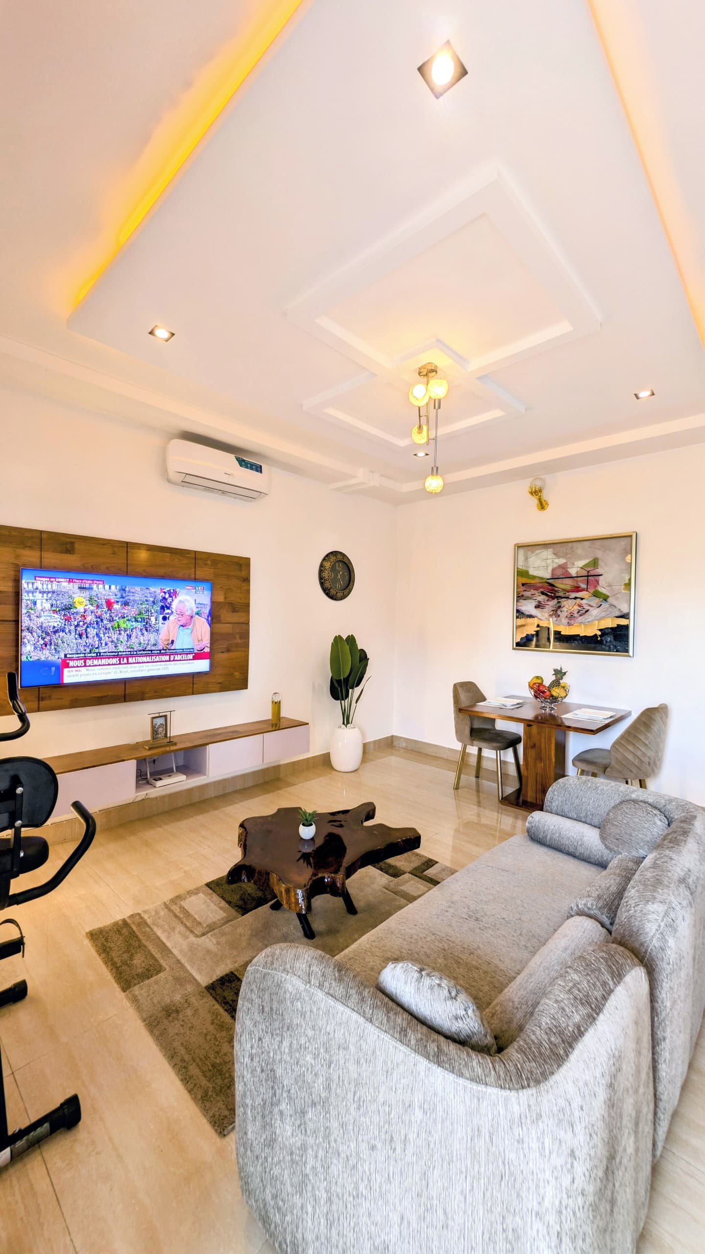 Confort et bien-être : Ventilateur intelligent Bluetooth avec éclairage intégré, chauffe-eau, et vélo d’appartement pour rester en forme.