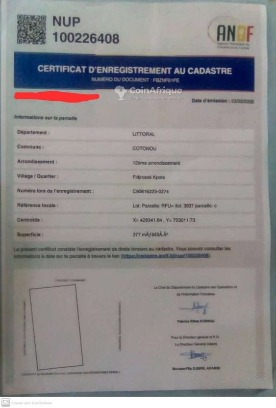 Documents légaux complets et en règle : Certificat d'enregistrement au cadastre (CEC), convention de vente, attestation de recasement, conformité du nom aux répertoires et quitus fiscal.
