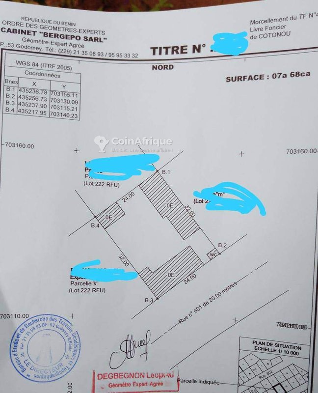 Découvrez cette parcelle exceptionnelle de 768 m², située dans un emplacement stratégique à Gbégamey, Cotonou, à moins de 100 mètres du pavé. Ce terrain dispose d’un titre foncier personnel, garantissant une acquisition sécurisée et sans tracas. Idéal pour un projet immobilier résidentiel ou commercial, il bénéficie de tous ses papiers légaux à jour, facilitant ainsi les démarches administratives. Profitez de cette opportunité rare, issue d’un héritage, pour investir dans un bien immobilier de qualité. Les atouts de ce terrain incluent :